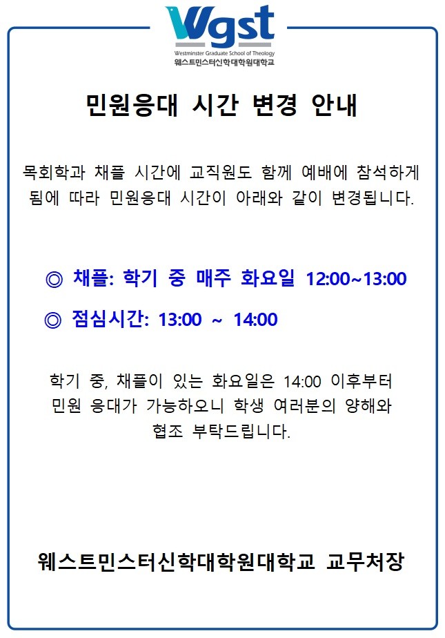 학기 중 매주 화요일 민원 응대 시간이 변경 되었습니다.