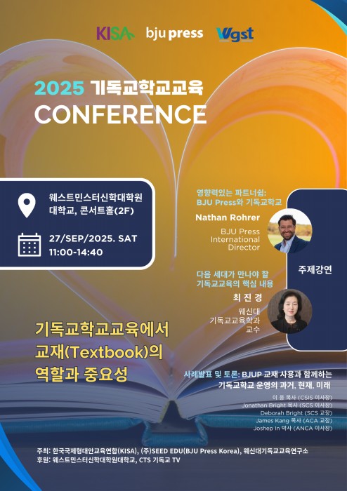 제  목 : 2025 기독교학교교육 CONFERENCE 주  제 : 기독교학교교육에서 교재(Textbook)의 역할과 중요성 일  자 :  2025. 9. 27.(토) 11:00-14:40  장소 :  웨신대 콘서트홀