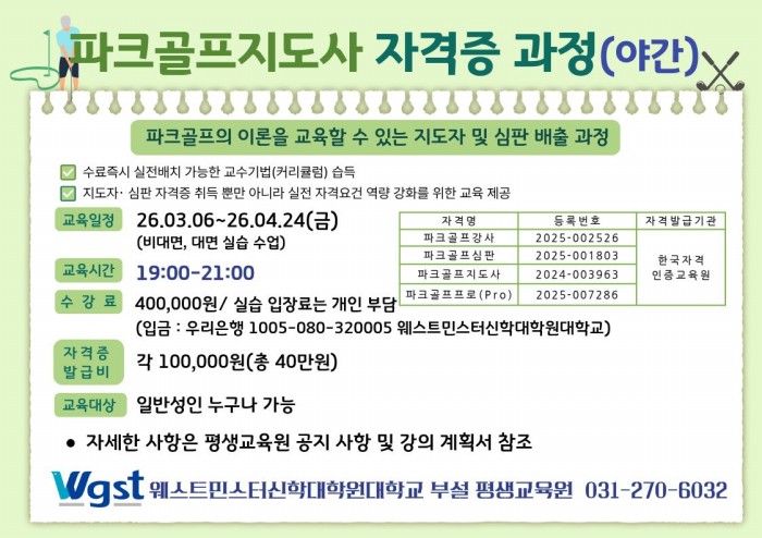 26년도 파크골프지도사 자격증 야간 과정 (비대면 및 대면 실습)을 아래와 같이 모집합니다.