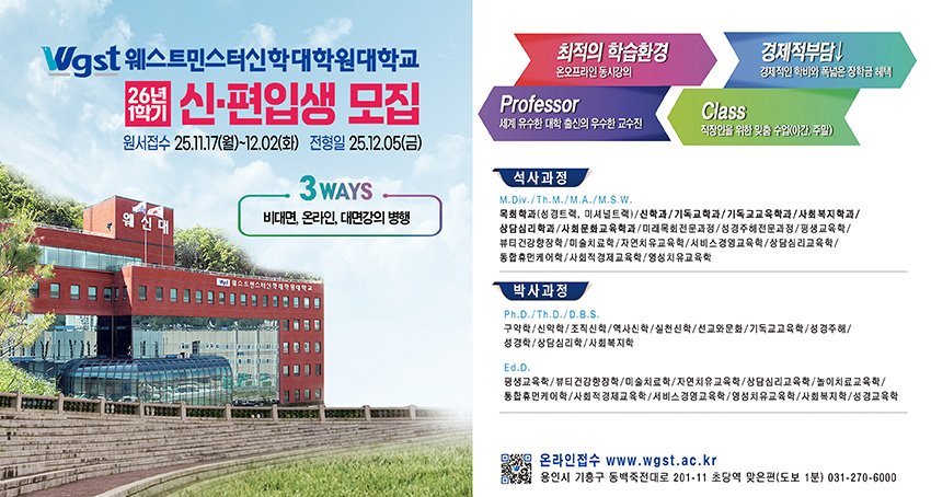 비쥬얼영역 바로 아래 컨텐츠로 2025.11학사일정 2025.11.03 ~ 2025.11.14 석박사통합과정 승급심사 기간 2025.11.10 ~ 2025.12.08 장학금 신청기간 2025.11.17 ~ 2025.12.08 전공학과 및 세부전공 변경신청 2025.11.17 ~ 2025.12.20 논문심사 및 결과보고서 제출 2025.11.18 M,Div. 종강예배(주간) 2025.11.20 M,Div. 종강예배(야간) 2025.11.21 석사과정 현장평가 보고서 제출 마감(M.Div./M.A 2025 학사일정 전체보기 학사일정은꼭 확인하세요. 웨신 소개 학과 안내 웨신도서관 학사행정망 소통마당 WGST NOTICE [재공고]학사관리시스템 구축사업 입찰 공고 [재공고]학사관리시스템 구축사업 입찰 공고...자세히보기... 학칙 변경안 공고 2025 기독교학교교육 CONFERENCE 안내 학사관리시스템 구축사업 입찰 공고 공지사항, 더보기 교수동정 최영숙 교수 극동방송 인터뷰 출연 김경식 교수 저서 출판 최영숙 교수 저서 출간 박은정 교수 두란노바이블칼리지 강의 교수동정, 더보기 예술심리센터 25여름-실버복지미술상담사(1급)개설=노인미술치.. 25-여름 임상미술심리상담사1급과정 개설 미술치료활용 지능의 이해 (졸업생 후원 무료강좌.. 콜라주 활용 미술치료세미나 예술심리센터, 더보기 평생교육원 2025_2 서양철학의 기독교적 이해 (개강일자.. 2025-1 놀이심리상담사2급 자격증 과정_매주.. [중요]25년 1차 경기도평생교육이용권 지원사업.. 2025-1 청소년상담사2급 필기 스터디 과정_.. 평생교육원, 더보기 목회지도자교육원 2025_2 봄학기 신입학 및 재학생 등록 안내.. 2025_1 겨울학기 신입학 및 재학생 등록 안.. 2024_3 가을학기 신입학 및 재학생 등록 안.. 2024_2 봄학기 신입학 및 재학생 등록 안내.. 목회지도자교육원, 더보기