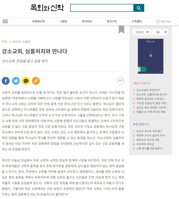 1. CTS 대담프로 <한국교회를 논하다> 출연 주 제 : 신년특집 2026 한국교회를 전망한다. 방영일시 : 1월 9일 오전 11시 2. <목회와 신학> 2026년 1월호에 "강소교회, 심플처치와 만나다."라는 제목으로 기고하였습니다. https://moksin.duranno.com/moksin/view/article.asp?articleNO=41246.jpg)